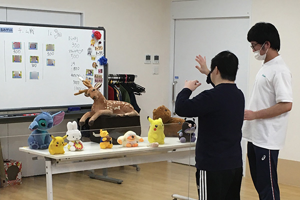 スタッフが考えたオリジナルのゲームを行なっています。利用者さまも一緒に進行をすることで、皆で一緒にゲームを盛り上げています。ゲームで使用する道具も手作りします。