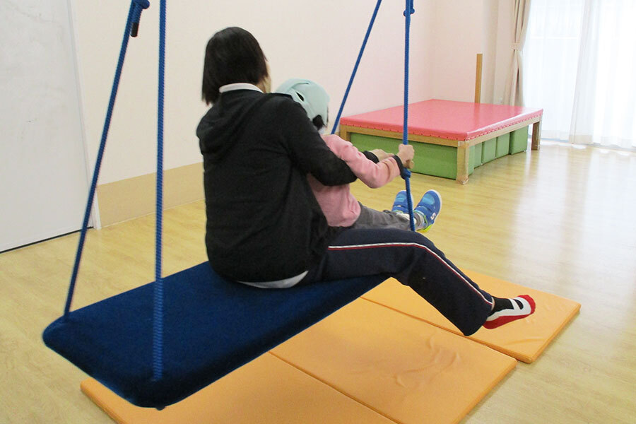 - 室内に大型のトランポリンやスイングを設置し、体を動かす活動を取り入れています。小さな揺れ・大きな揺れなど、一人一人に合わせた段階や楽しみ方の工夫をしています。